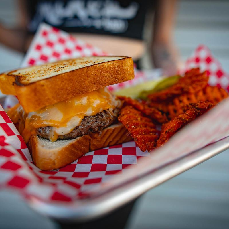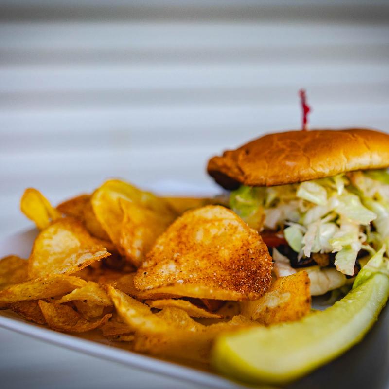 Fresh, hand-pattied ground beef cooked to medium well (Unless otherwise requested) served with house-made potato chips • Sub Fries $1.99 | Sub Sweet Potato Fries $2.79 | Sub Okra $2.79 • Cheese Choices: American, Swiss, Monterey Jack, Pepper-Jack, Cheddar